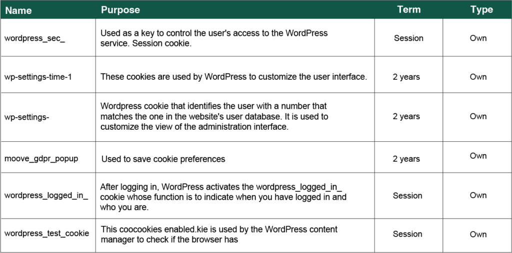 • Session cookies: Designed to collect and store data while the user accesses a website. They are usually used to store information that is only relevant for the provision of the service requested by the user on a one-time basis (e.g., a list of purchased products).